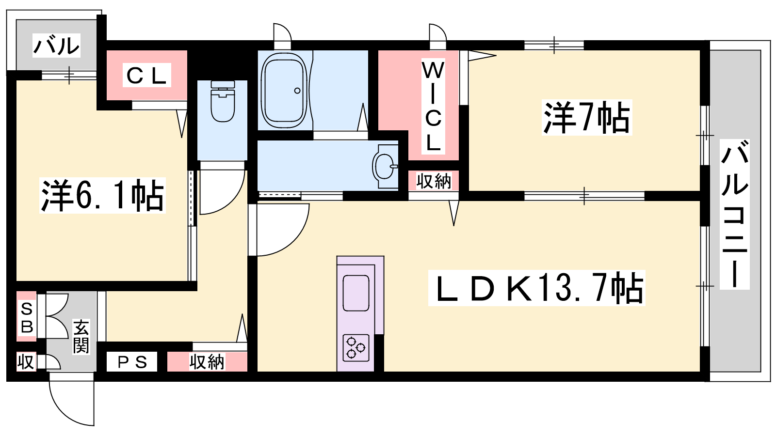- LDK13.7帖、洋室7帖、洋室6.1帖