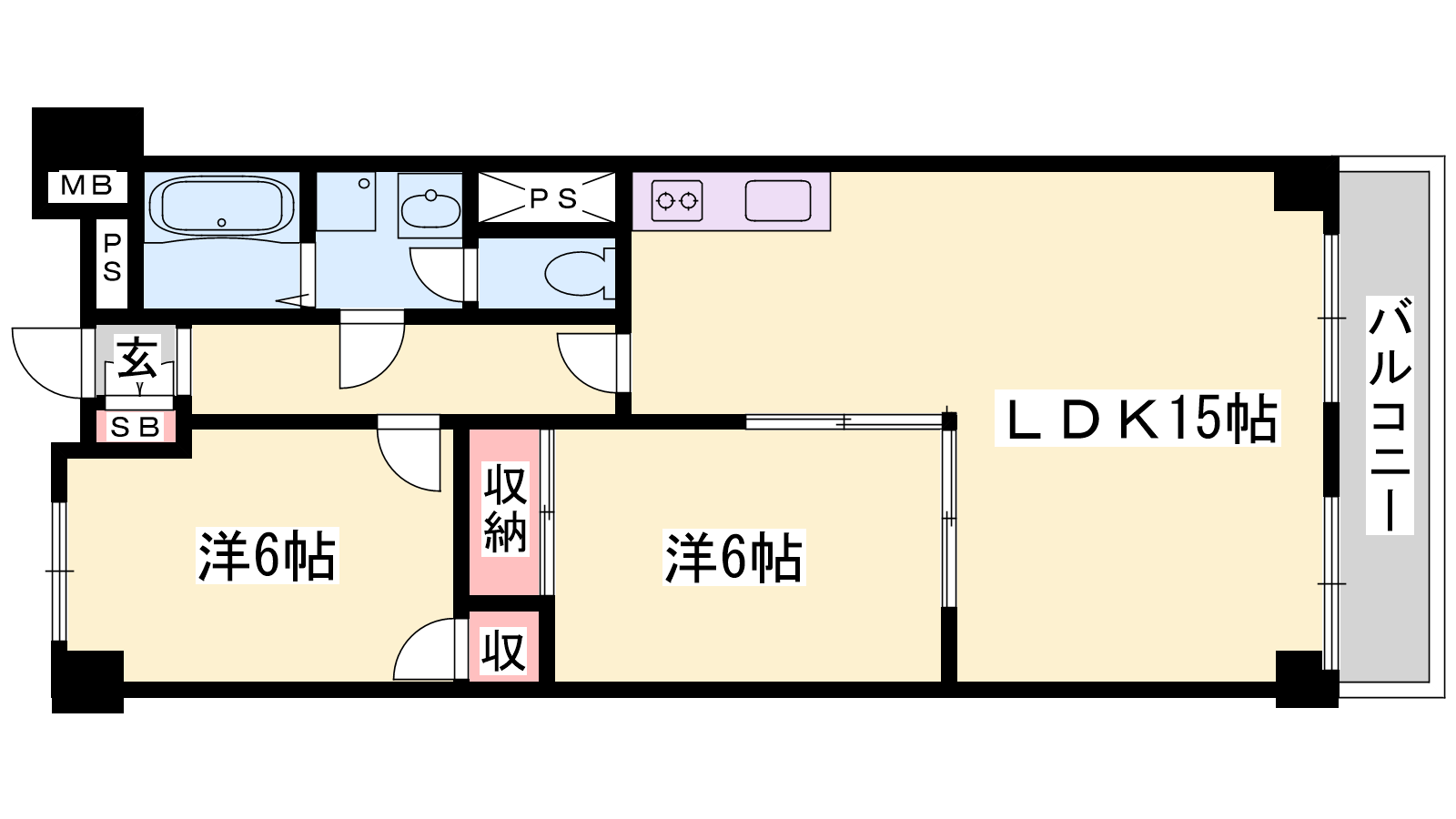 - LDK15帖、洋室6帖、洋室6帖