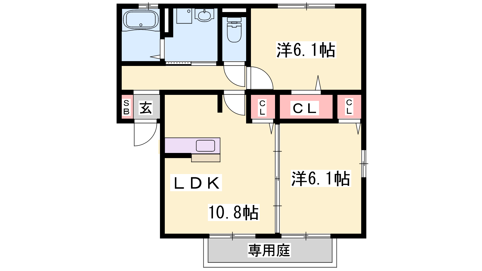 - LDK10.8帖、洋室6.1帖、洋室6.1帖