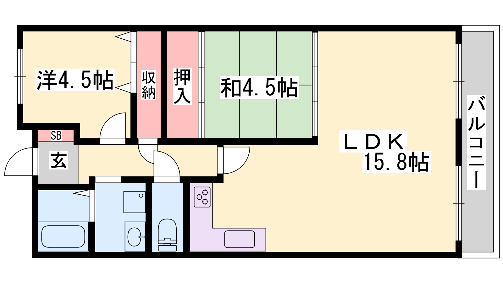 - LDK15.8帖、洋室4.5帖、和室4.5帖