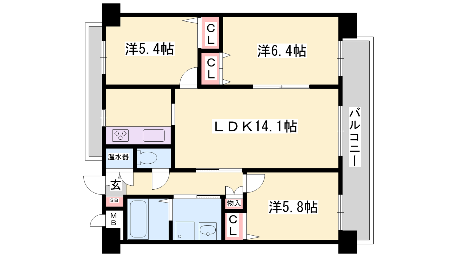 - LDK14.1帖、洋室6.4帖、洋室5.8帖、洋室5.4帖