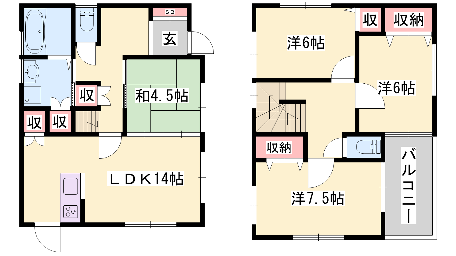 - LDK14帖、洋室7.5帖、洋室6帖、洋室6帖、和室4.5帖