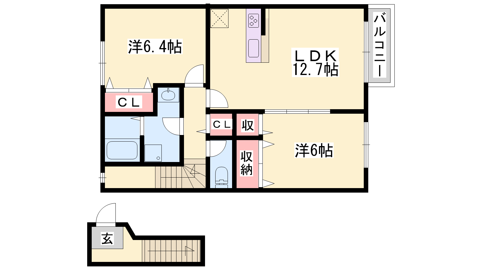 - LDK12.7帖、洋室6.4帖、洋室6帖