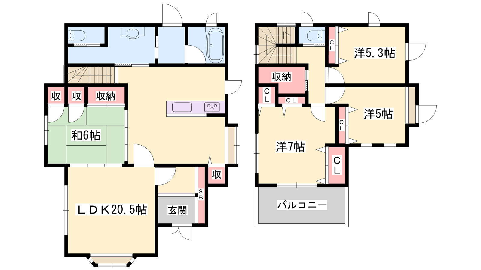 - LDK20.5帖、洋室7帖、和室6帖、洋室5帖、洋室5.3帖