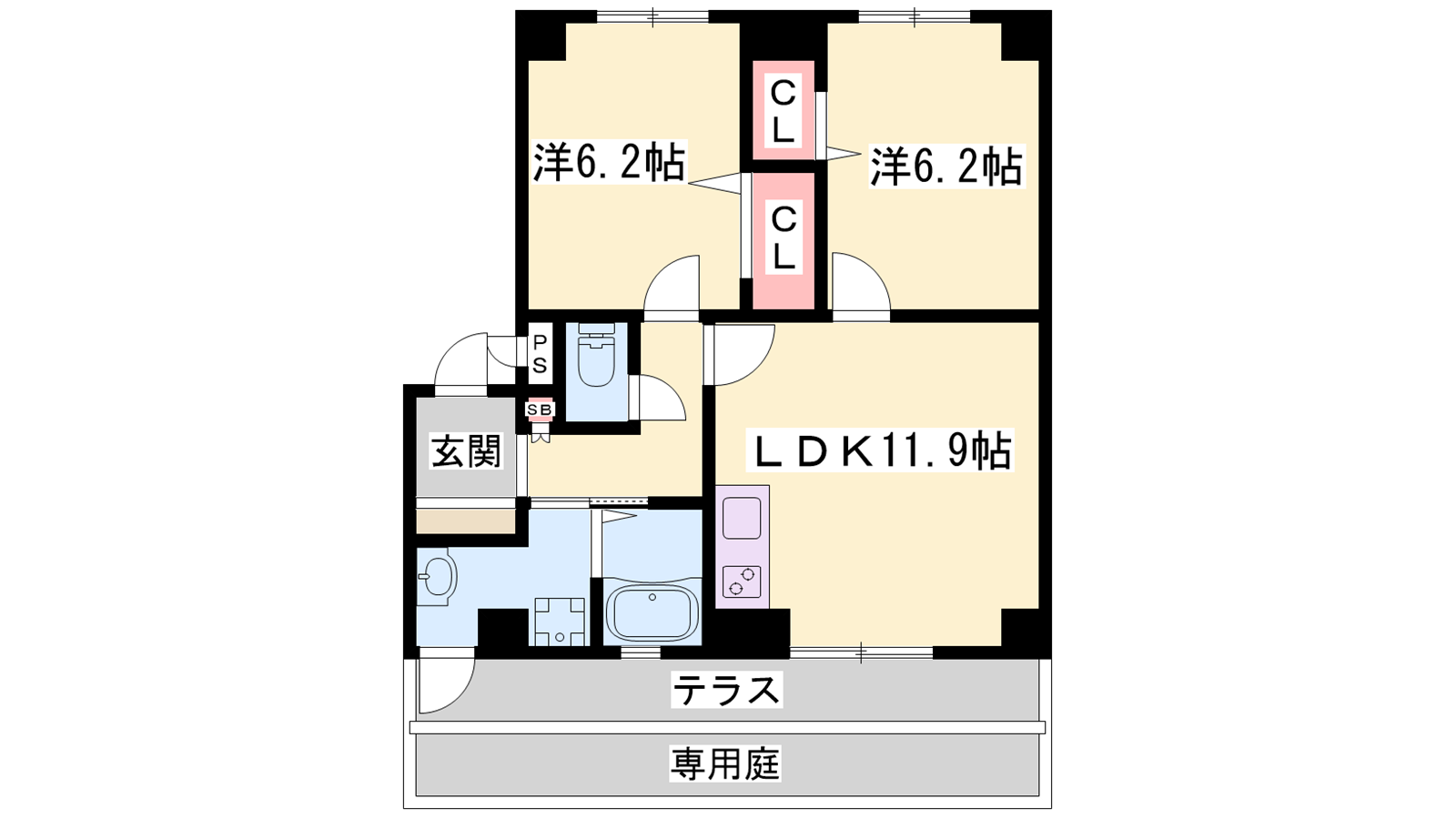 - LDK11.9帖、洋室6.2帖、洋室6.2帖