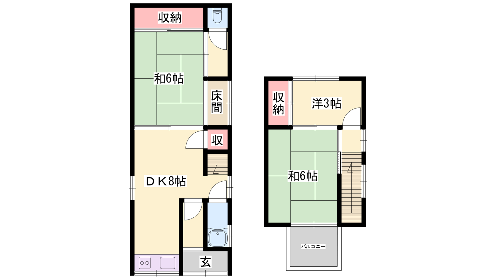 - DK8帖、和室6帖、和室6帖、洋室3帖