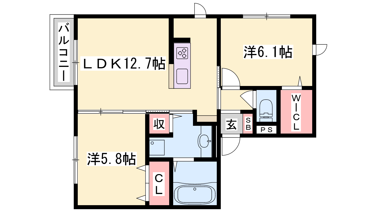 - LDK12.7帖、洋室6.1帖、洋室5.8帖