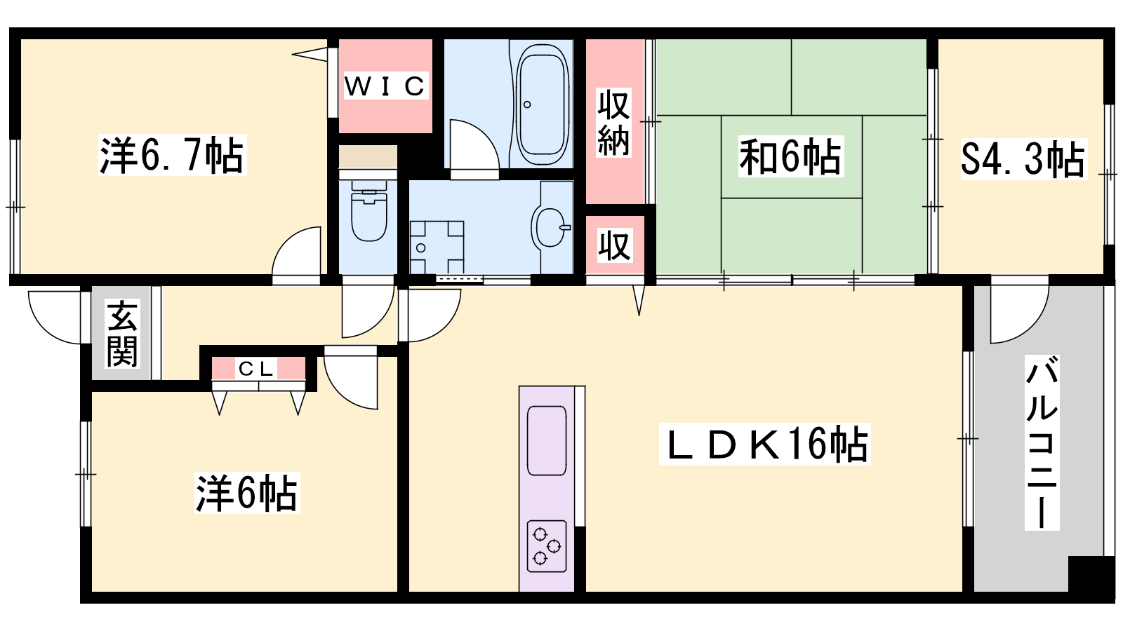 - LDK16帖、洋室6.7帖、洋室6帖、和室6帖、S4.3帖