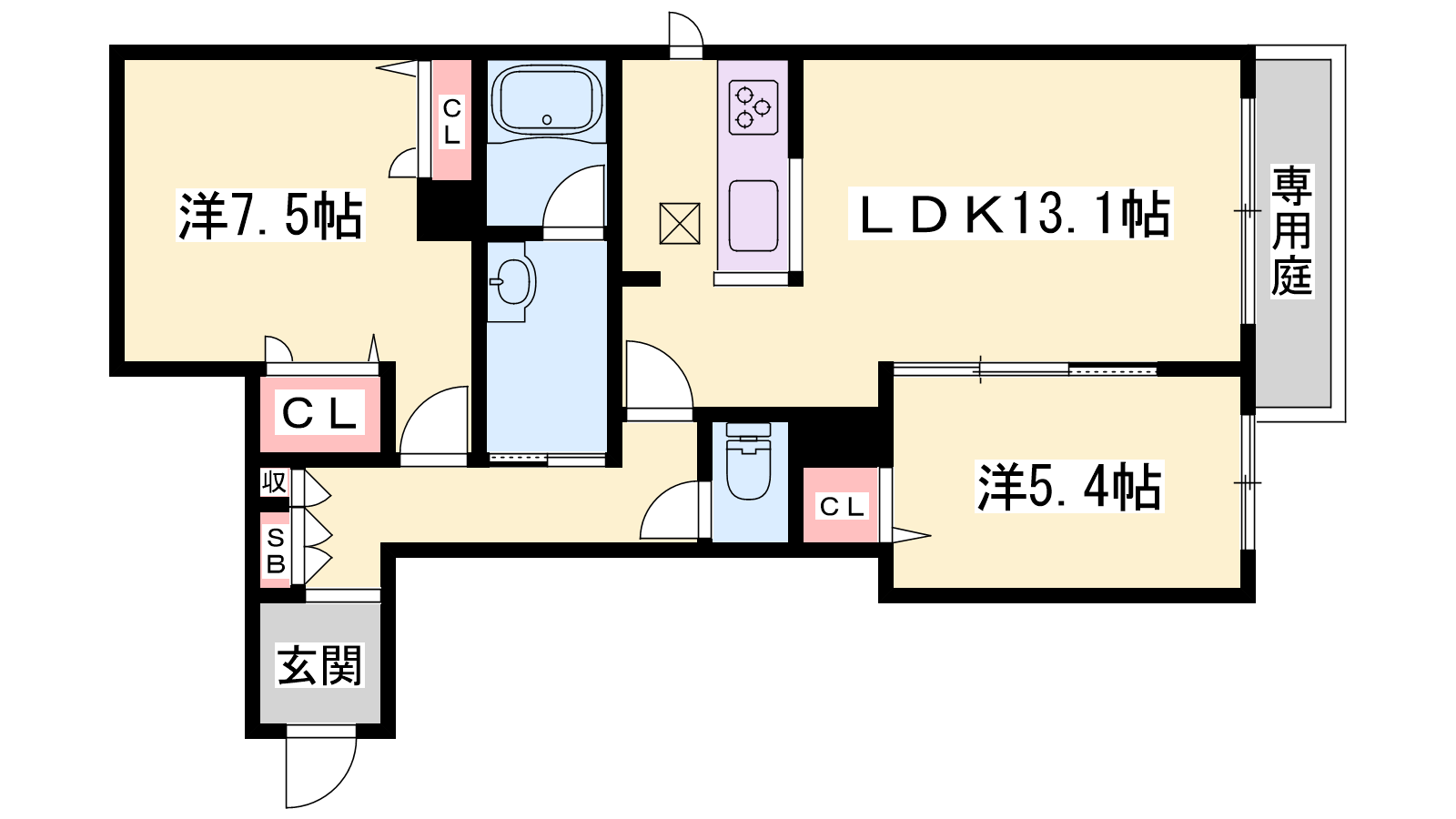 - LDK13.1帖、洋室7.5帖、洋室5.4帖