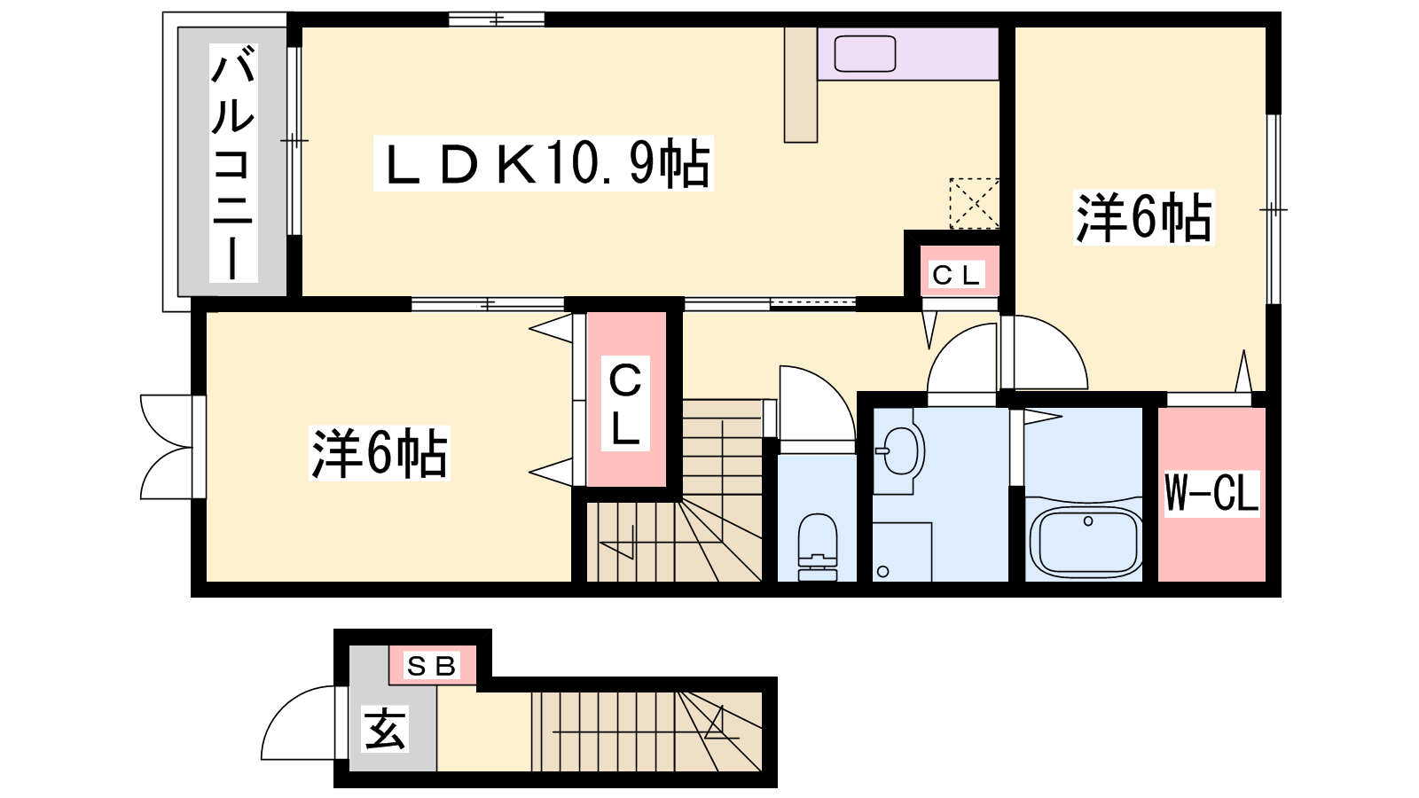 - LDK10.9帖、洋室6帖、洋室6帖