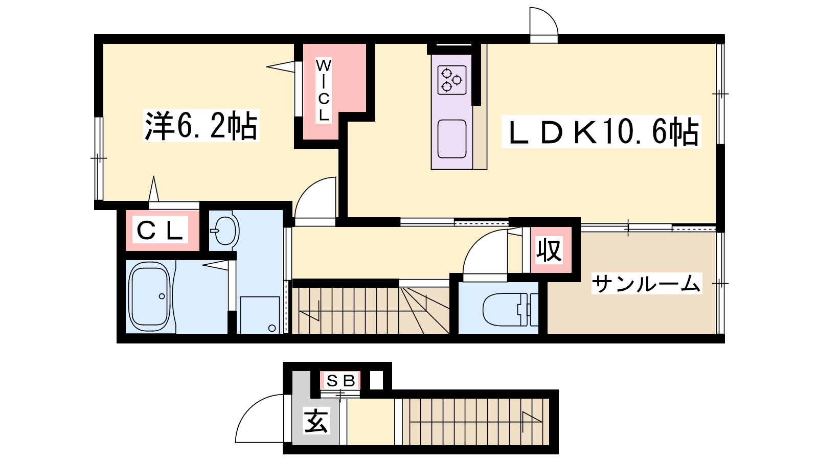 - 洋室10.6帖、洋室6.2帖