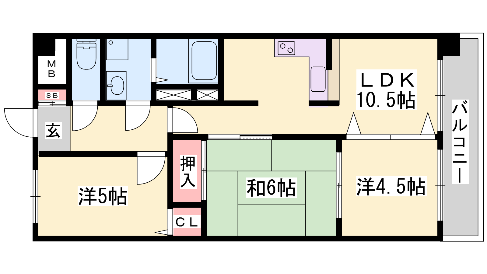 - LDK10.5帖、洋室5帖、洋室4.5帖、和室6帖