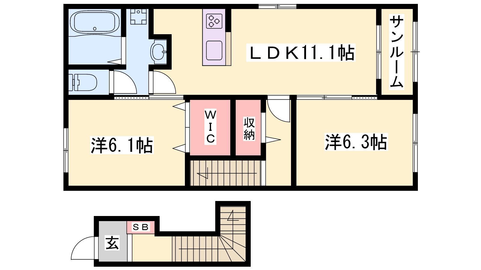 - LDK11.1帖、洋室6.3帖、洋室6.1帖