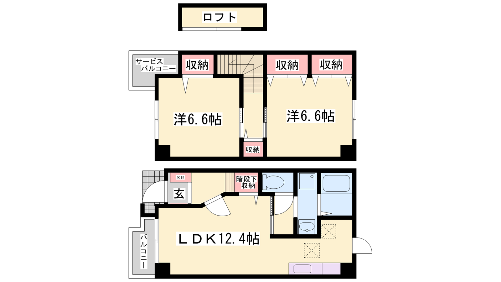 - LDK12.4帖、洋室6.6帖、洋室6.6帖