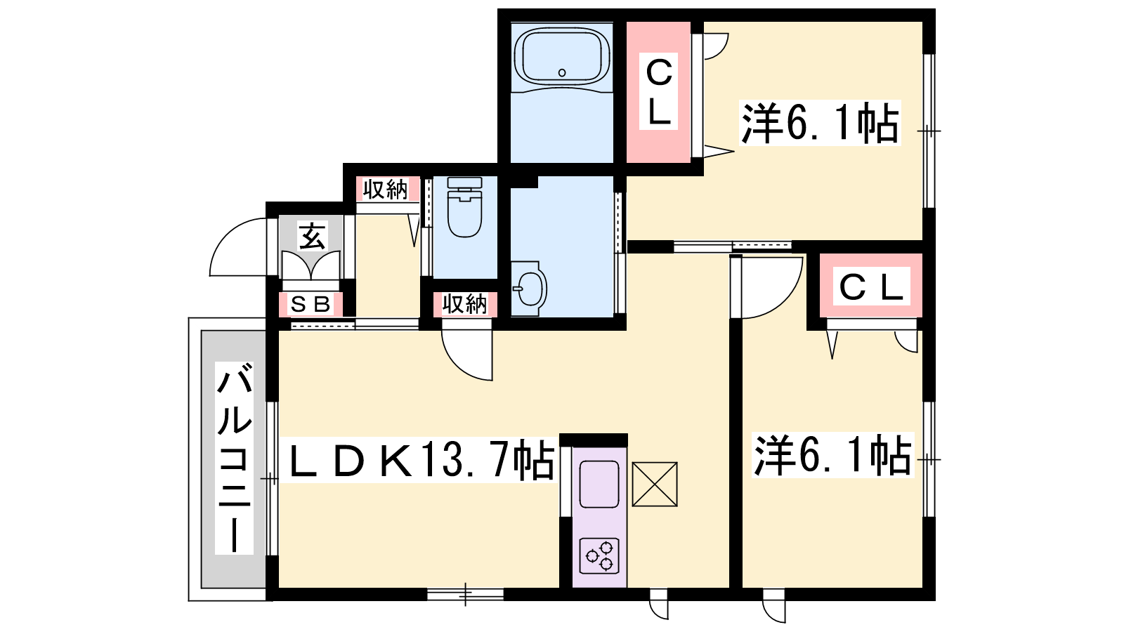 - LDK13.7帖、洋室6.1帖、洋室6.1帖