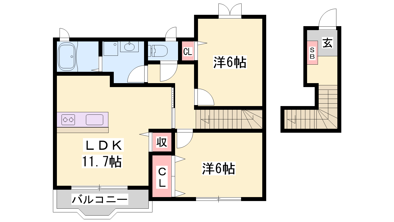 - LDK11.7帖、洋室6.1帖、洋室6.1帖