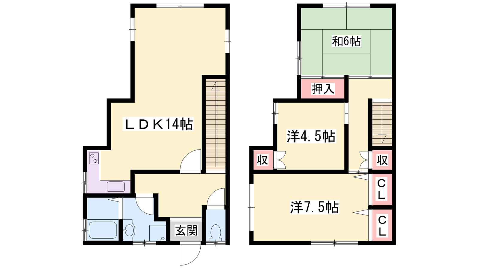 - LDK14帖、洋室7.5帖、洋室4.5帖、和室6帖