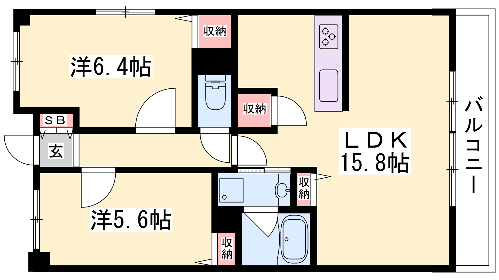 - LDK15.8帖、洋室6.4帖、洋室5.6帖