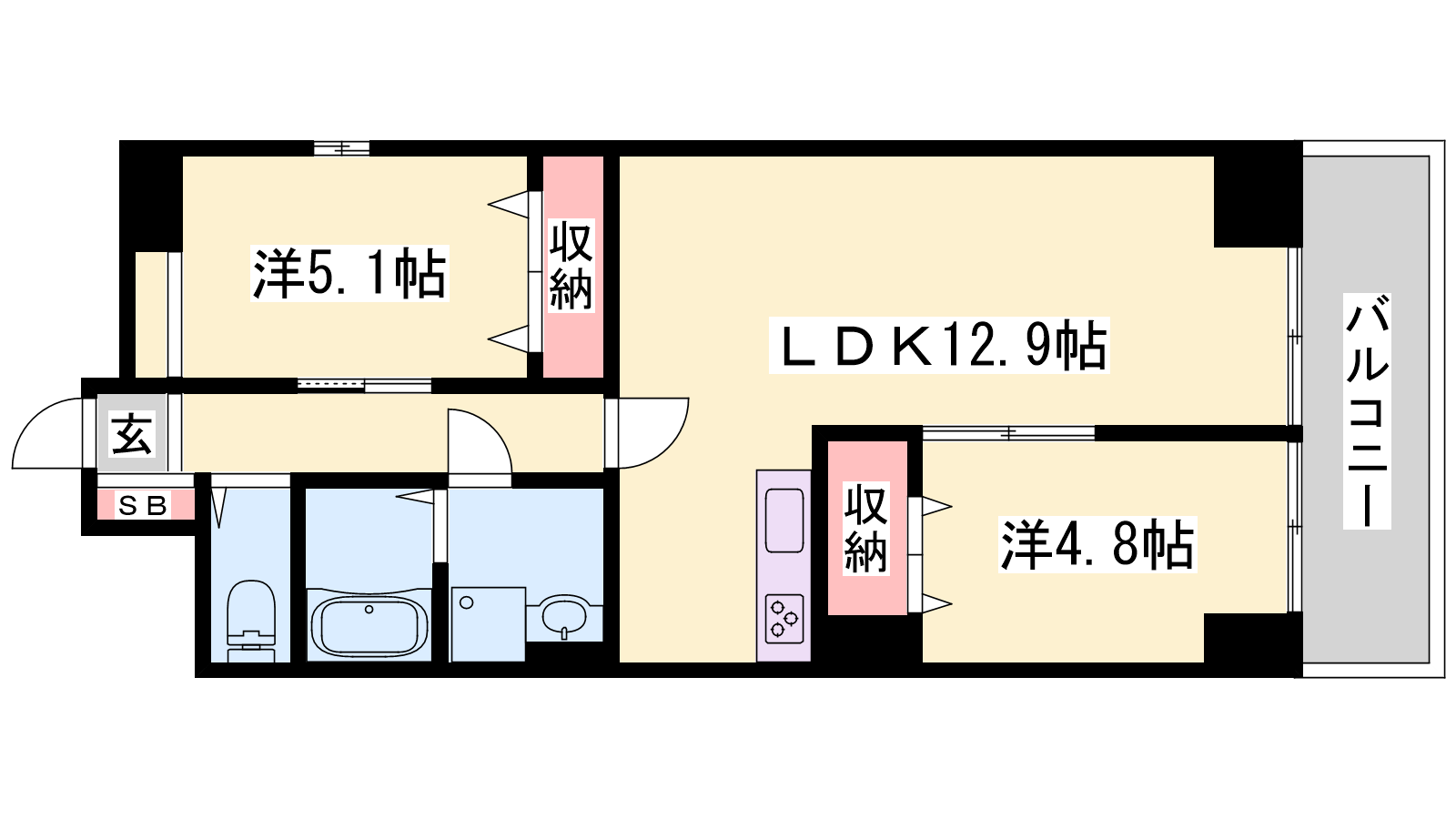 - LDK12.9帖、洋室5.1帖、洋室4.8帖