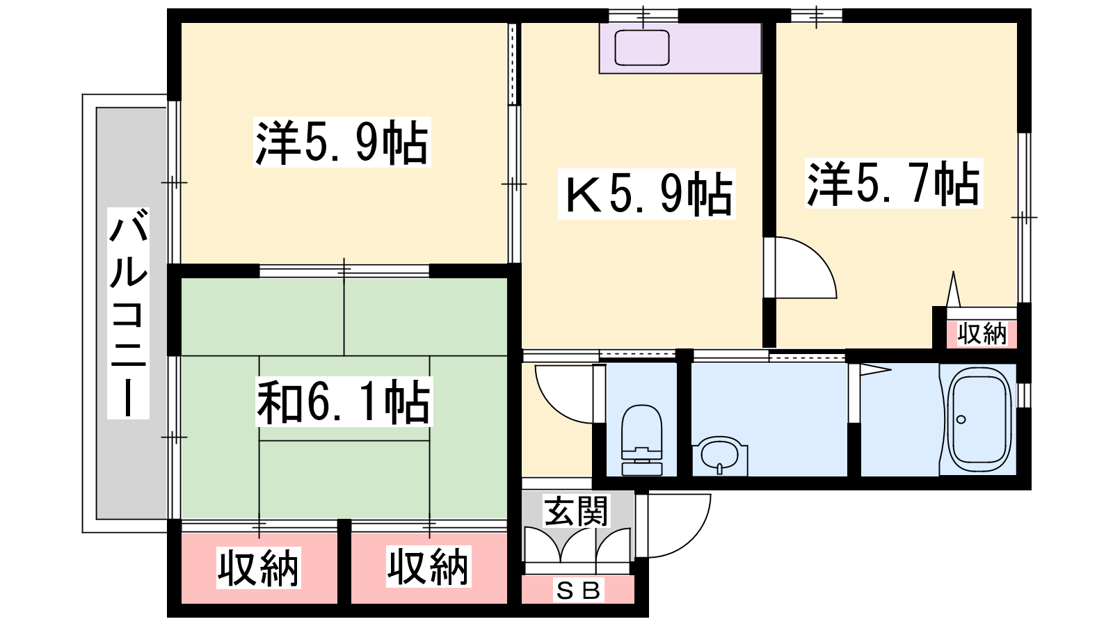 - K5.9帖、洋室5.9帖、洋室5.7帖、和室6.1帖
