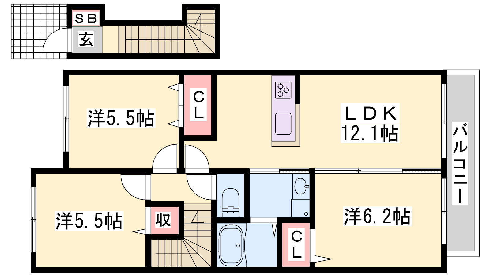 - LDK12.1帖、洋室6.2帖、洋室5.5帖、洋室5.5帖