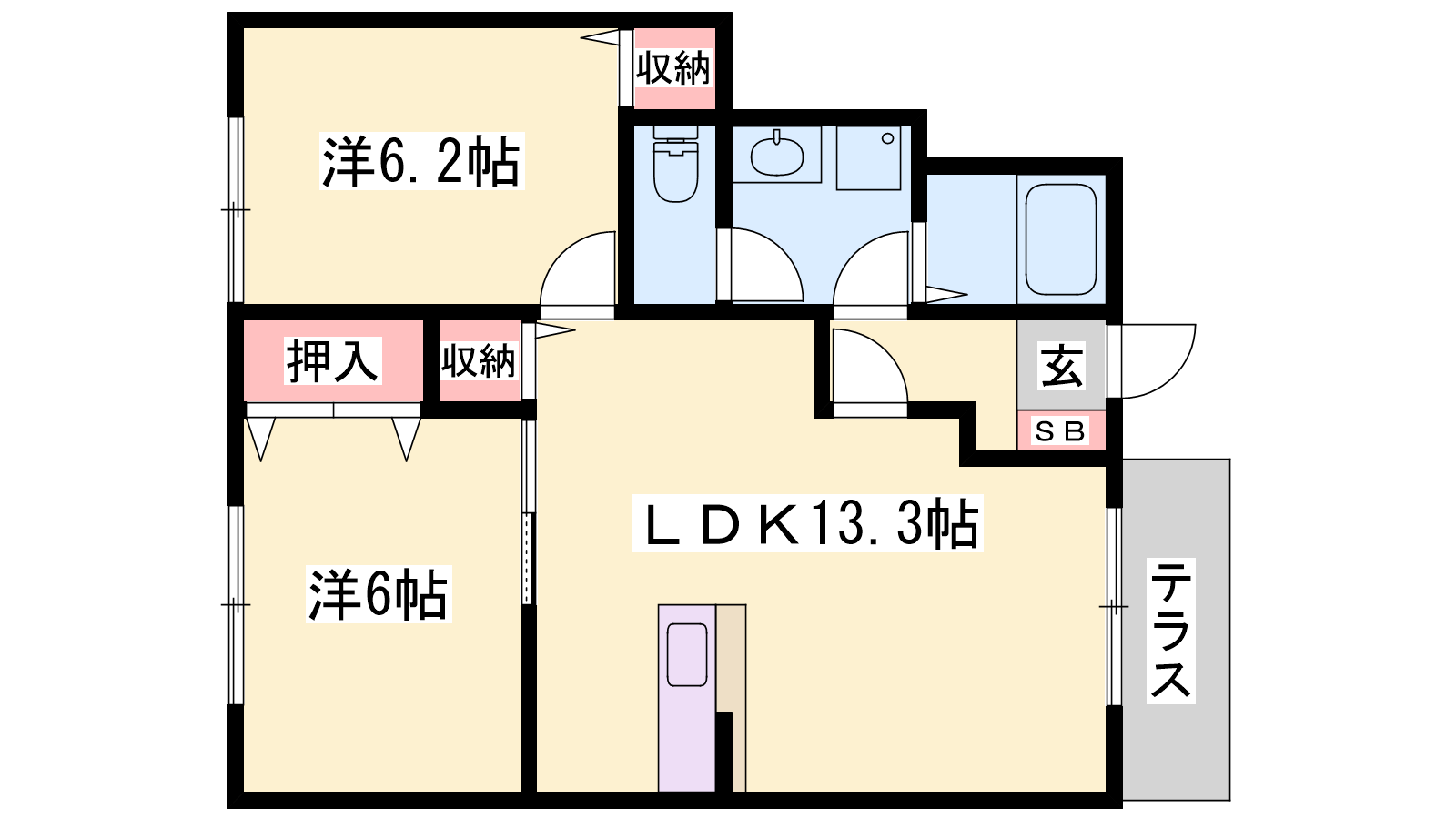 - LDK13.3帖、洋室6.2帖、洋室6帖