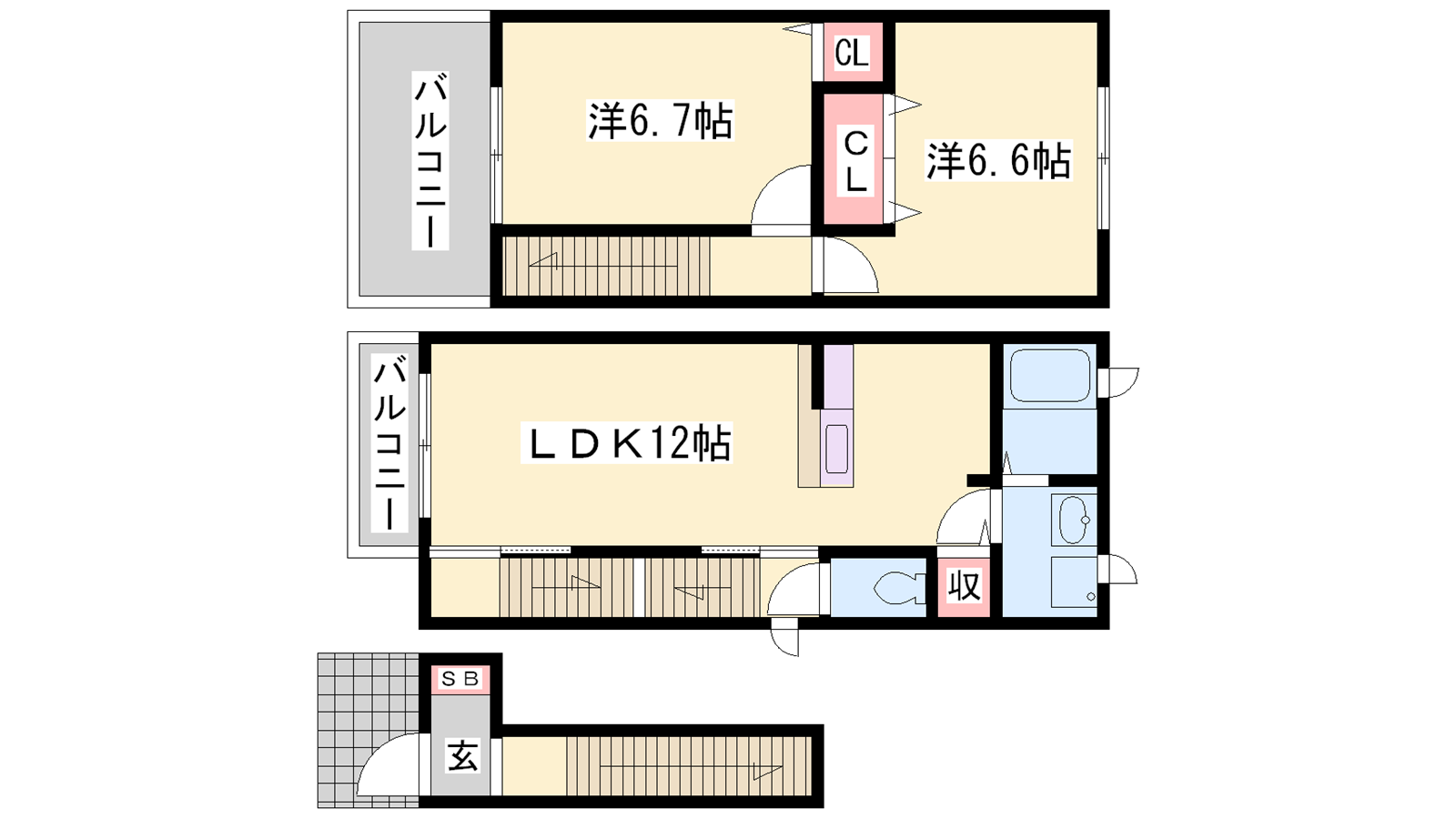 - LDK12帖、洋室6.7帖、洋室6.6帖