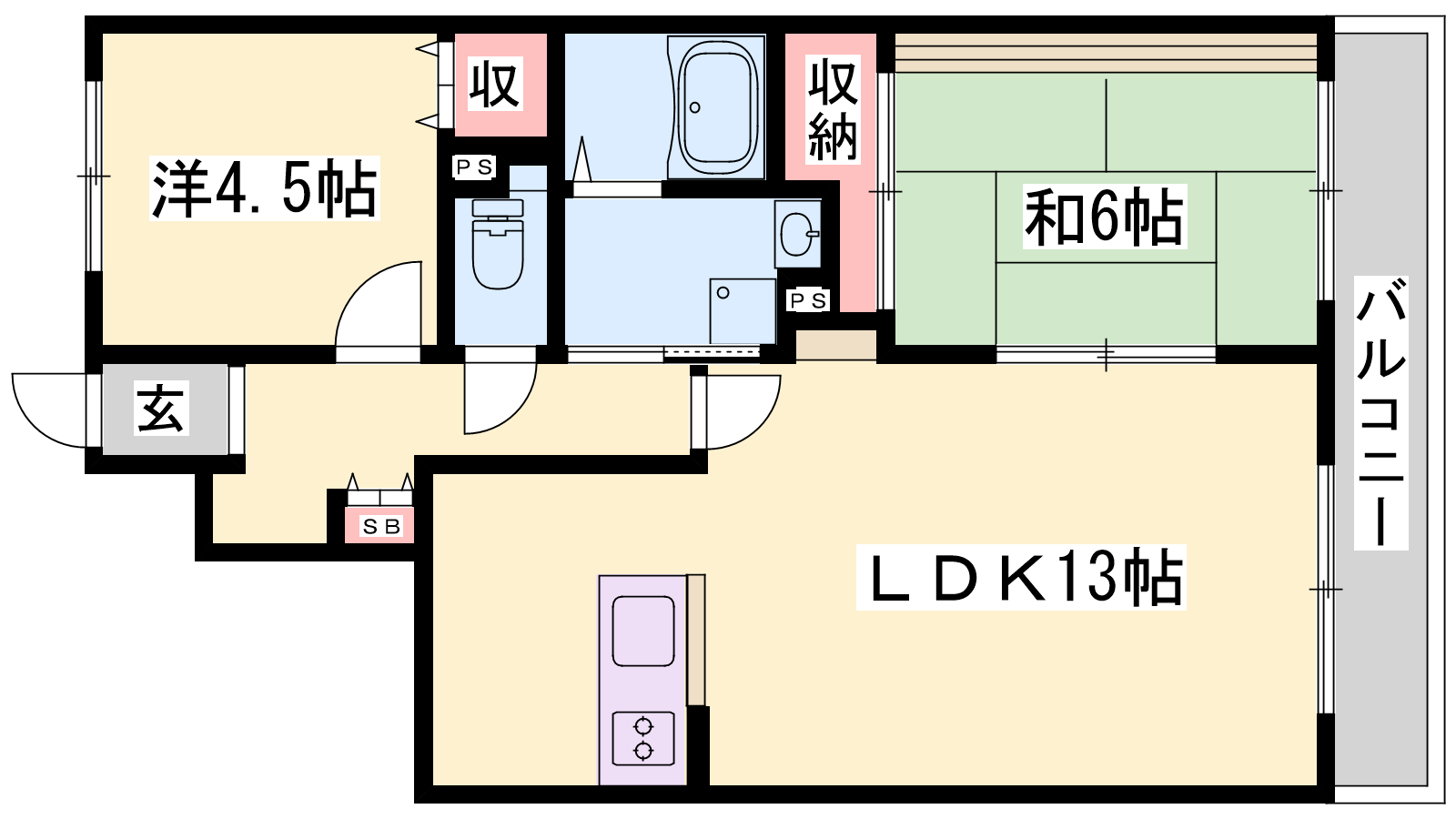 - LDK13帖、洋室4.5帖、和室6帖