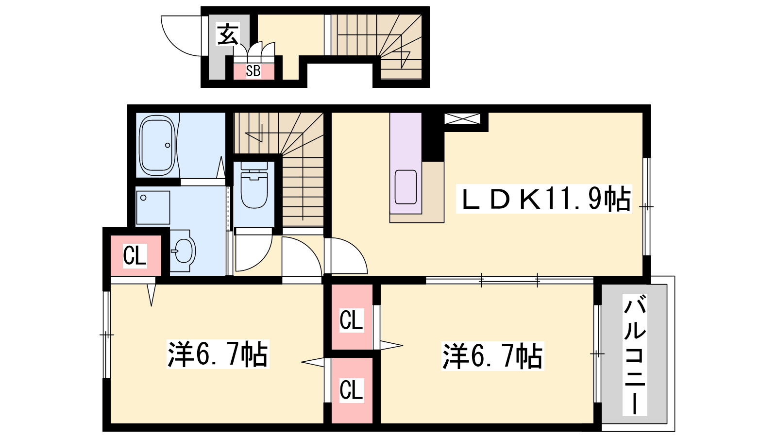 - LDK11.9帖、洋室6.7帖、洋室6.7帖