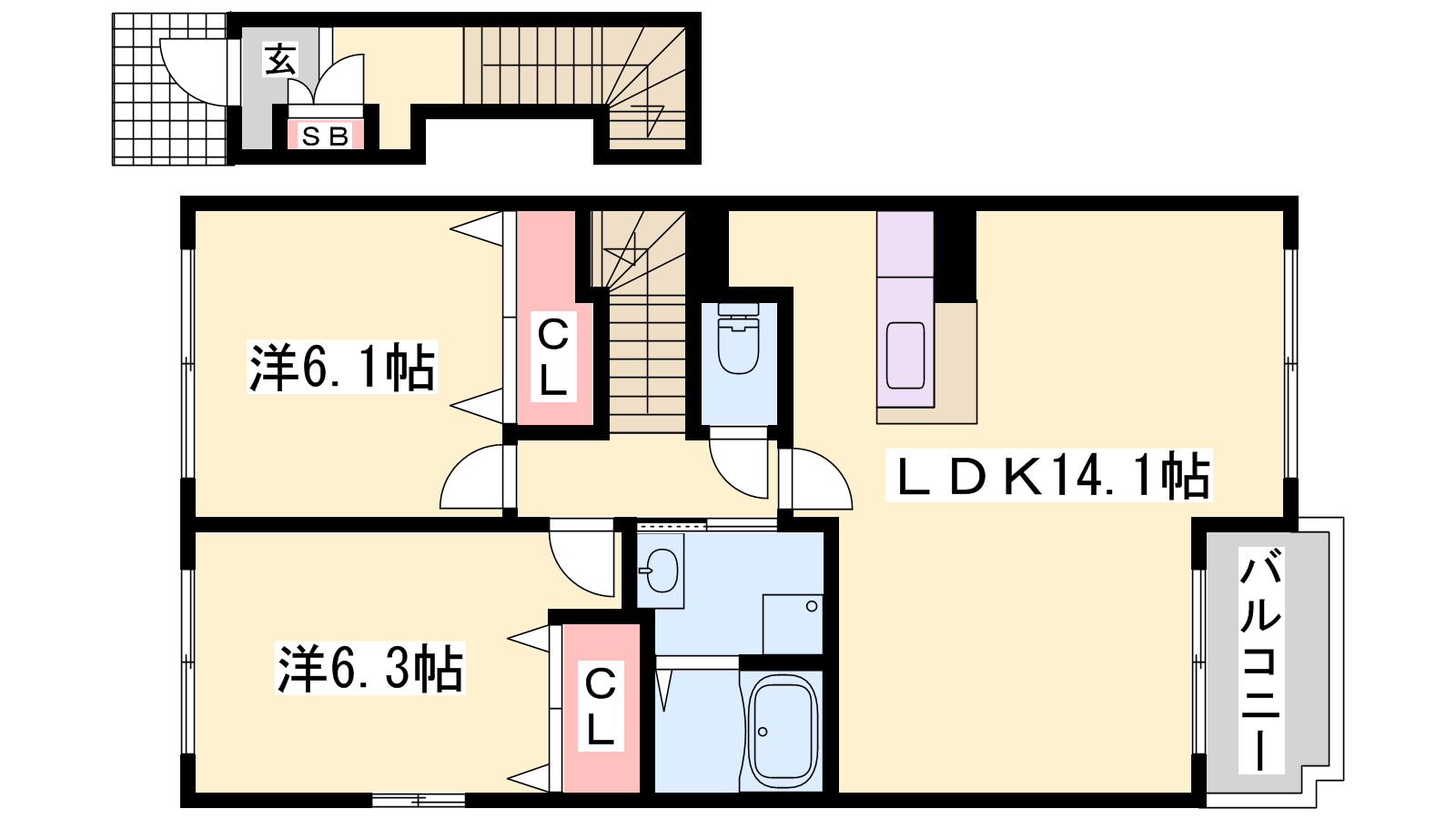 - LDK14.1帖、洋室6.3帖、洋室6.1帖