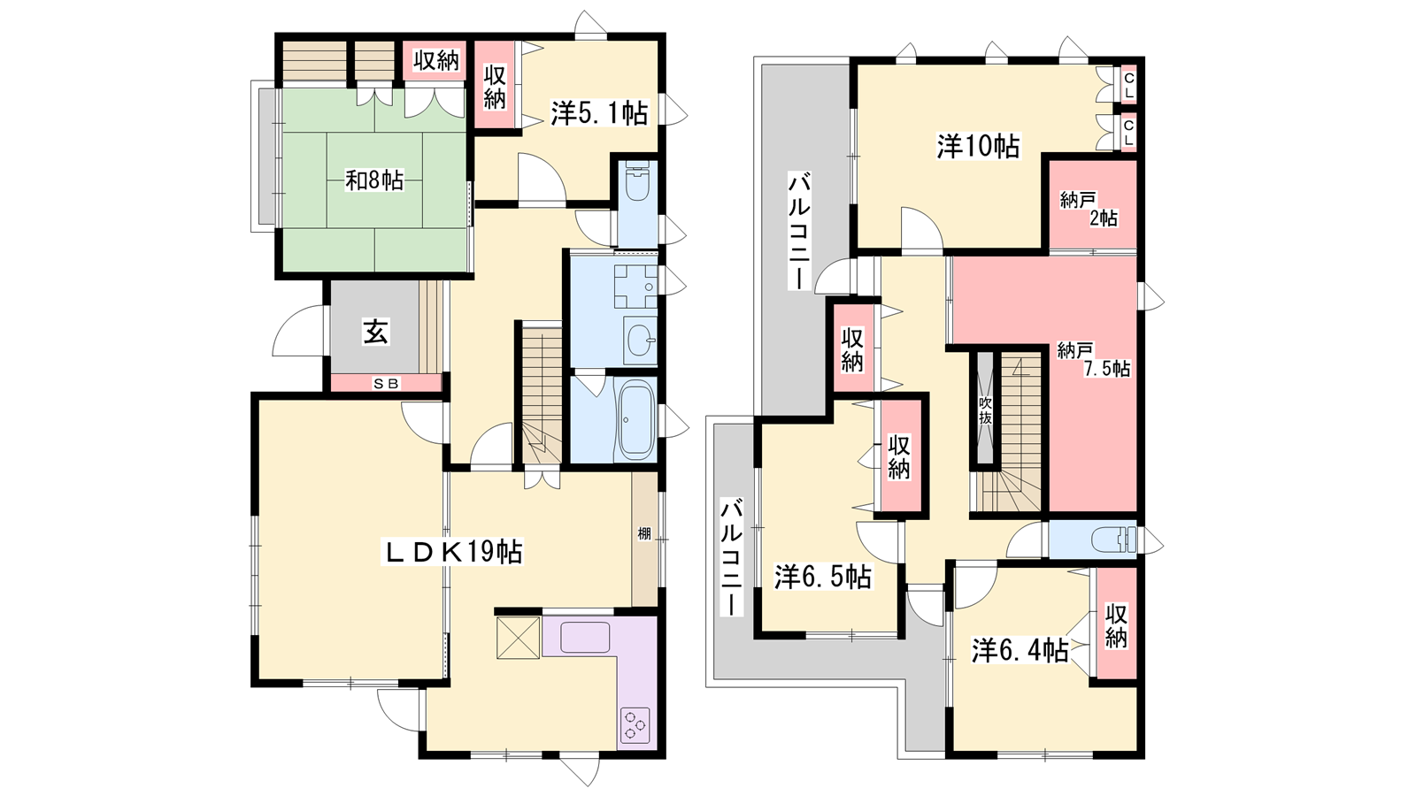 - LDK19帖、洋室10帖、洋室6.5帖、洋室6.4帖、洋室5.1帖、和室8帖