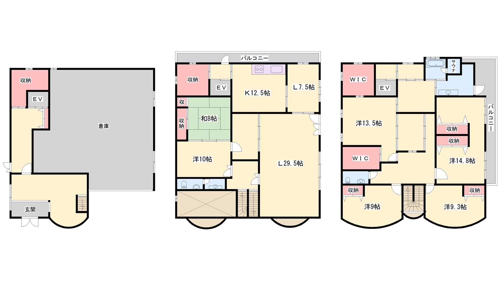- LDK49帖、洋室14.8帖、洋室13.5帖、洋室10帖、洋室9.3帖、洋室9帖、和室8帖