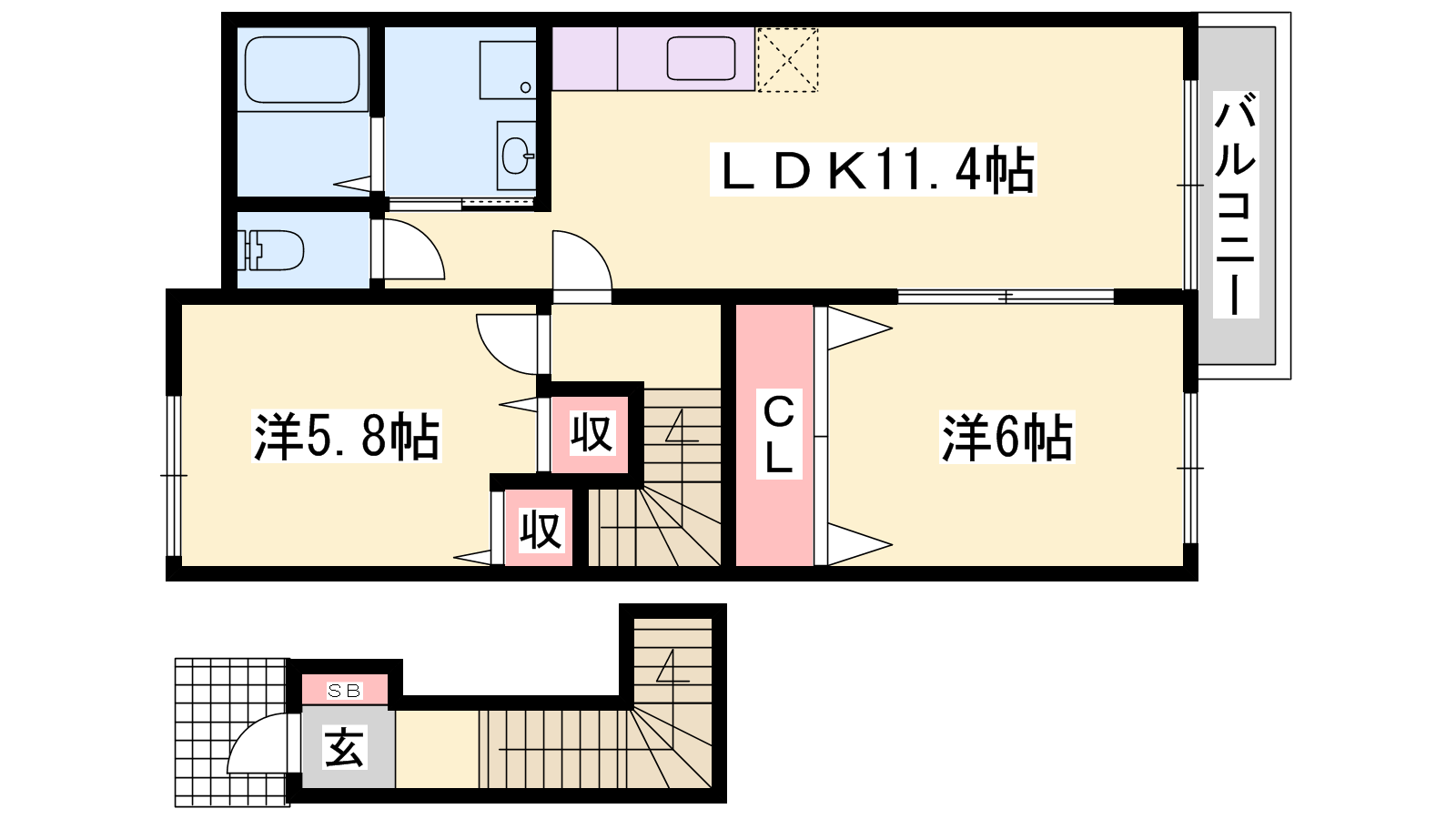 - K11.4帖、洋室6帖、洋室5.8帖