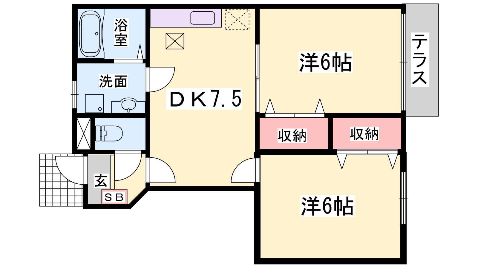 - DK7.5帖、洋室6帖、洋室6帖