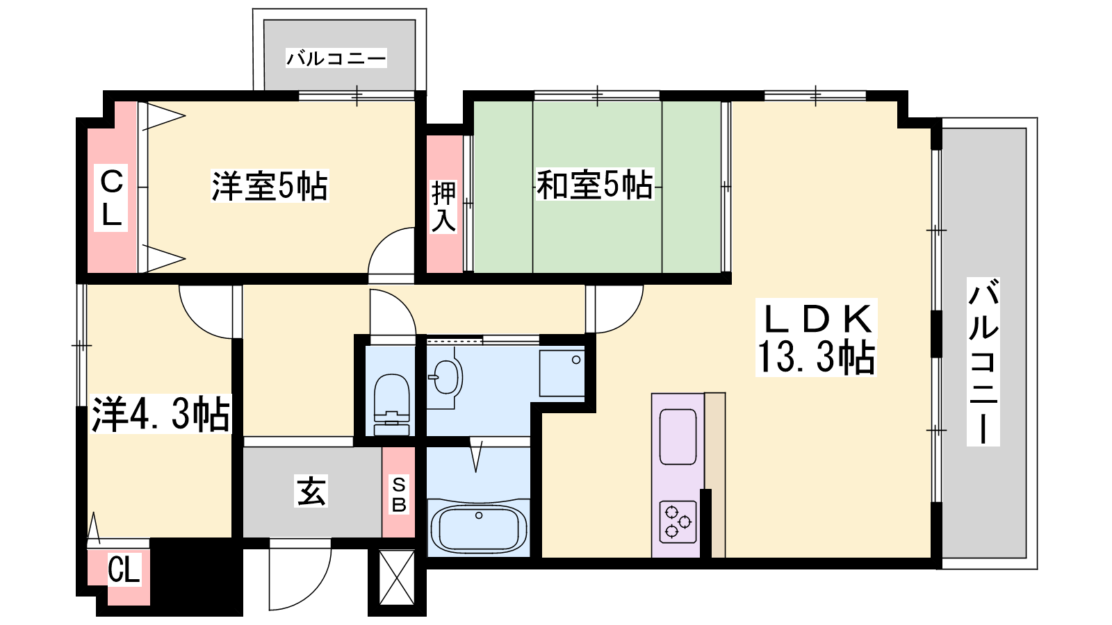 - LDK13.3帖、洋室5帖、洋室4.3帖、和室5帖
