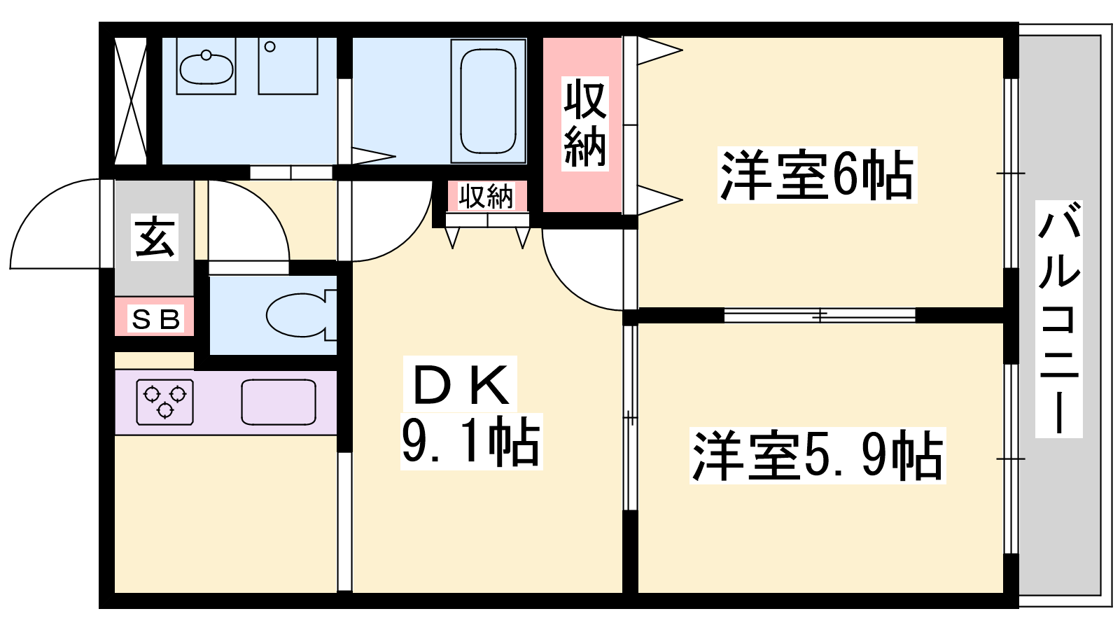 - DK9.1帖、洋室6帖、洋室5.9帖