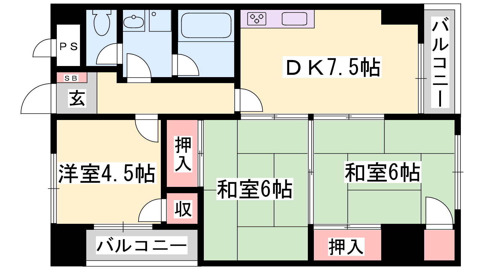 - DK7.5帖、洋室4.5帖、和室6帖、和室6帖