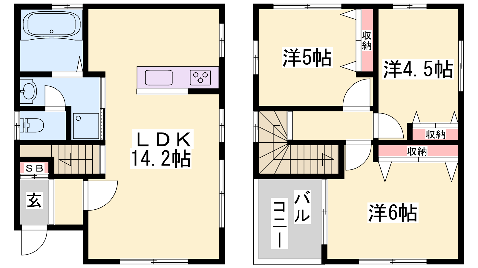 - LDK14.2帖、洋室6帖、洋室5帖、洋室4.5帖