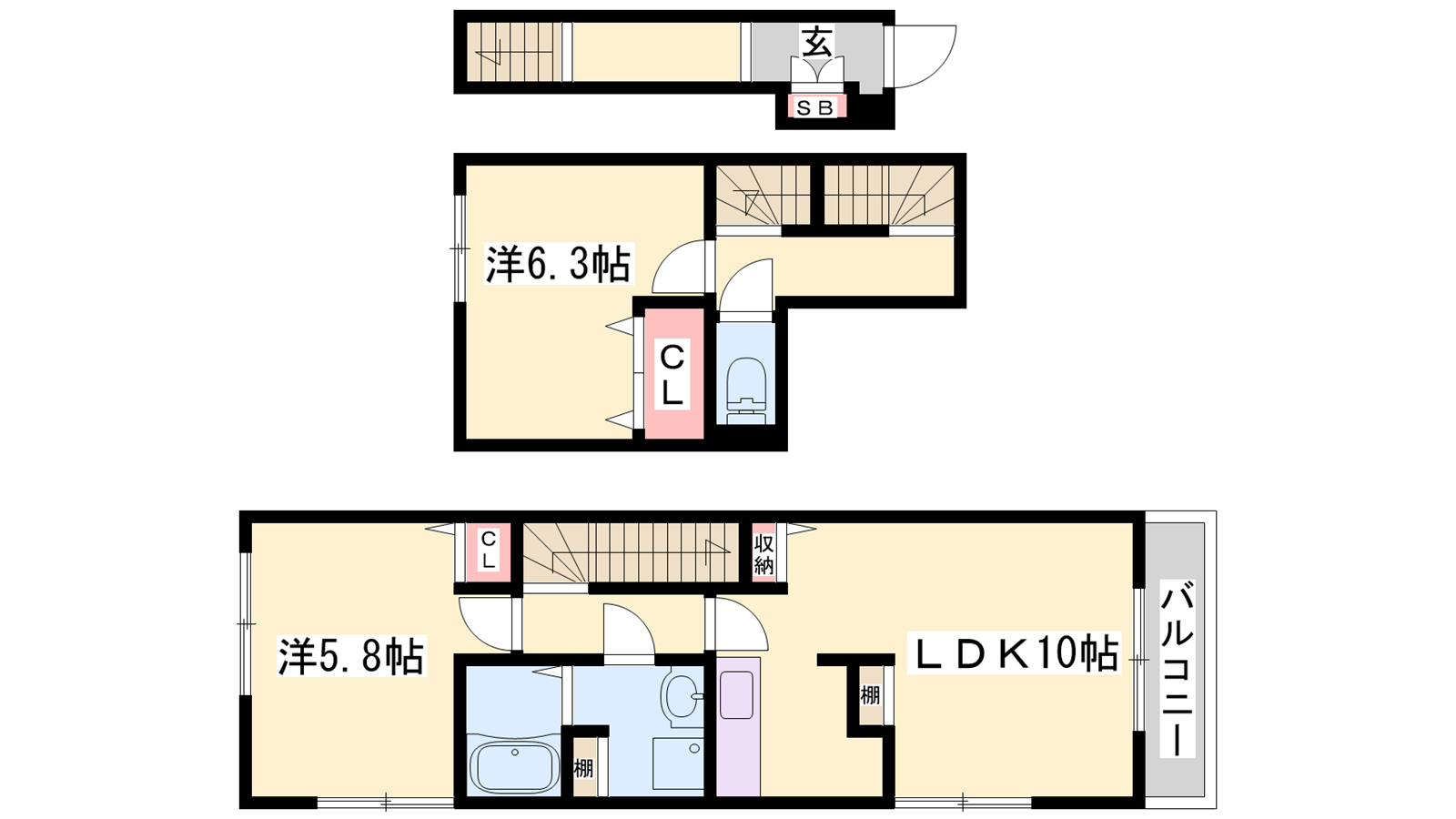- LDK10帖、洋室6.3帖、洋室5.8帖