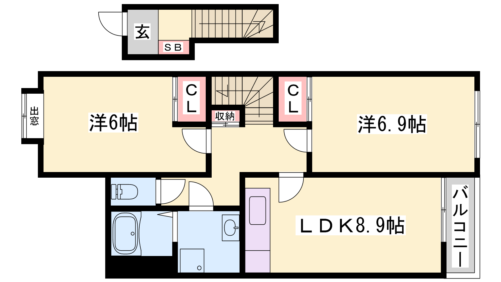 - LDK8.9帖、洋室6.9帖、洋室6帖