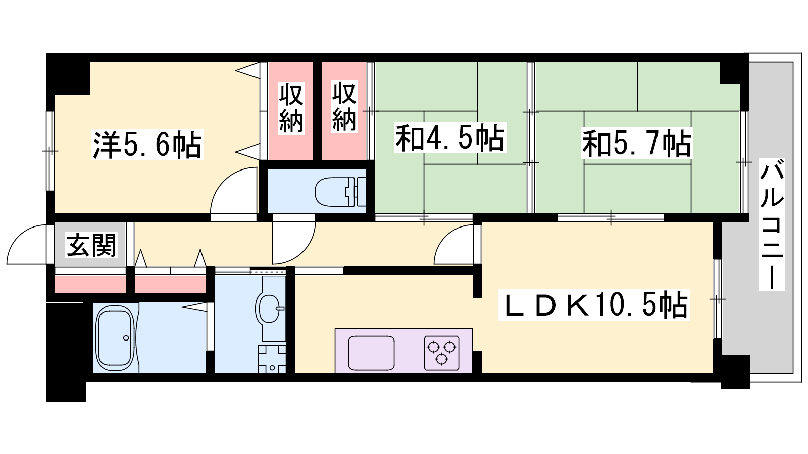 - LDK10.5帖、洋室5.6帖、和室5.7帖、和室4.5帖