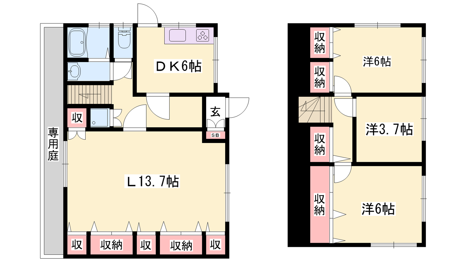 - L13.7帖、DK6帖、洋室6帖、洋室6帖、洋室3.7帖