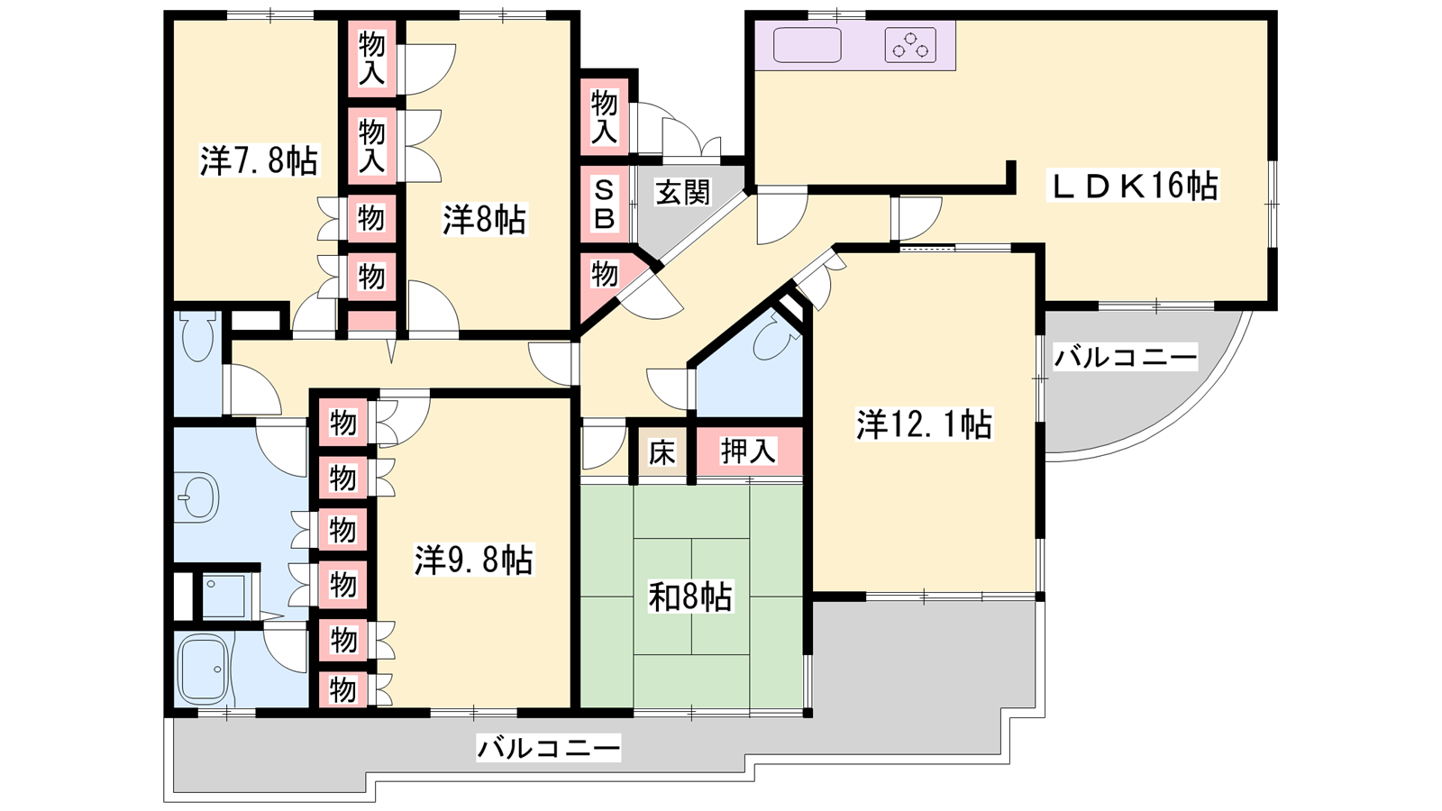 - LDK16帖、洋室12.1帖、洋室9.8帖、洋室8帖、洋室7.8帖、和室8帖