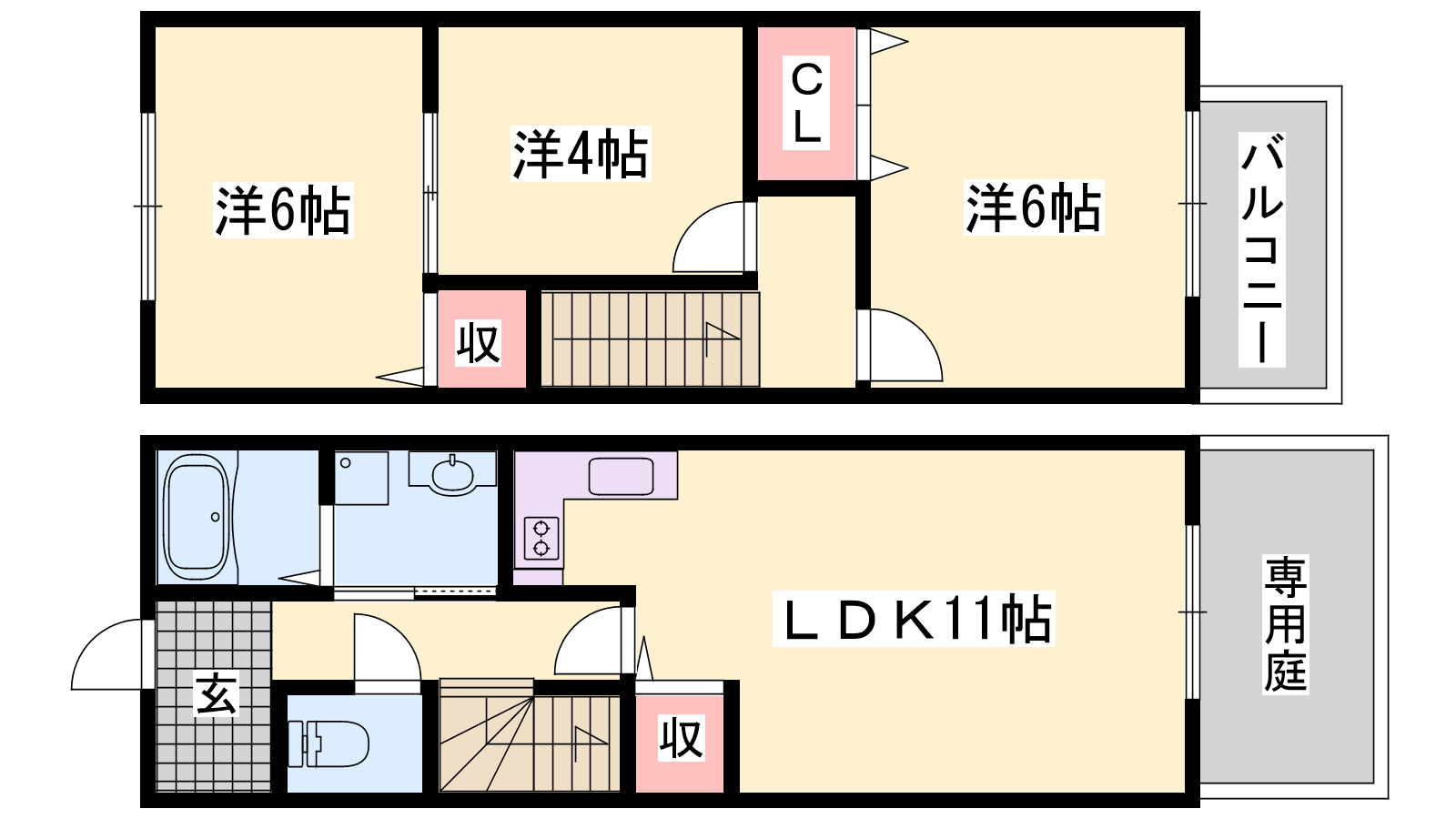 - LDK11帖、洋室6帖、洋室6帖、洋室4帖