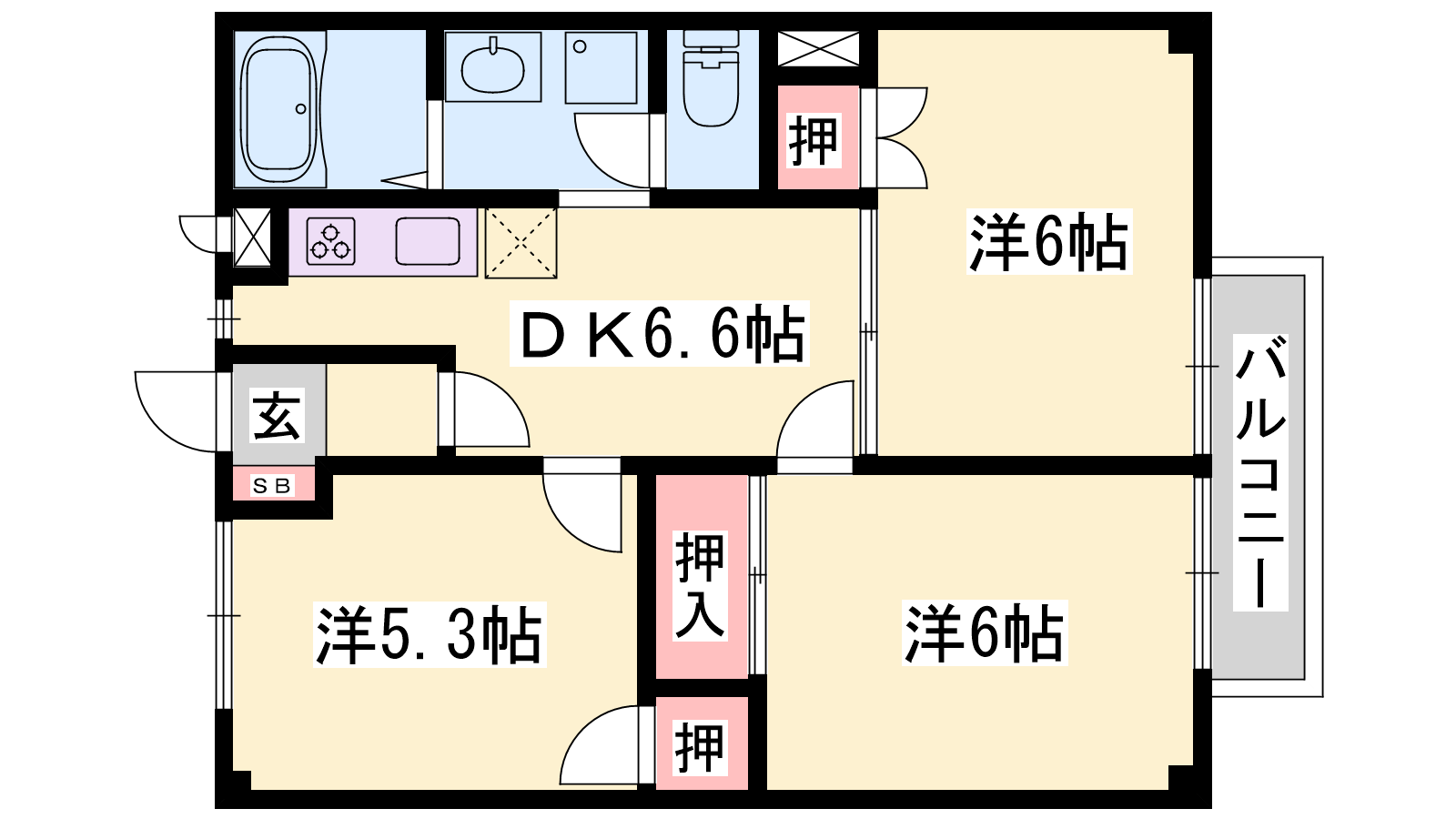 - DK6.6帖、洋室6帖、洋室6帖、洋室5.3帖