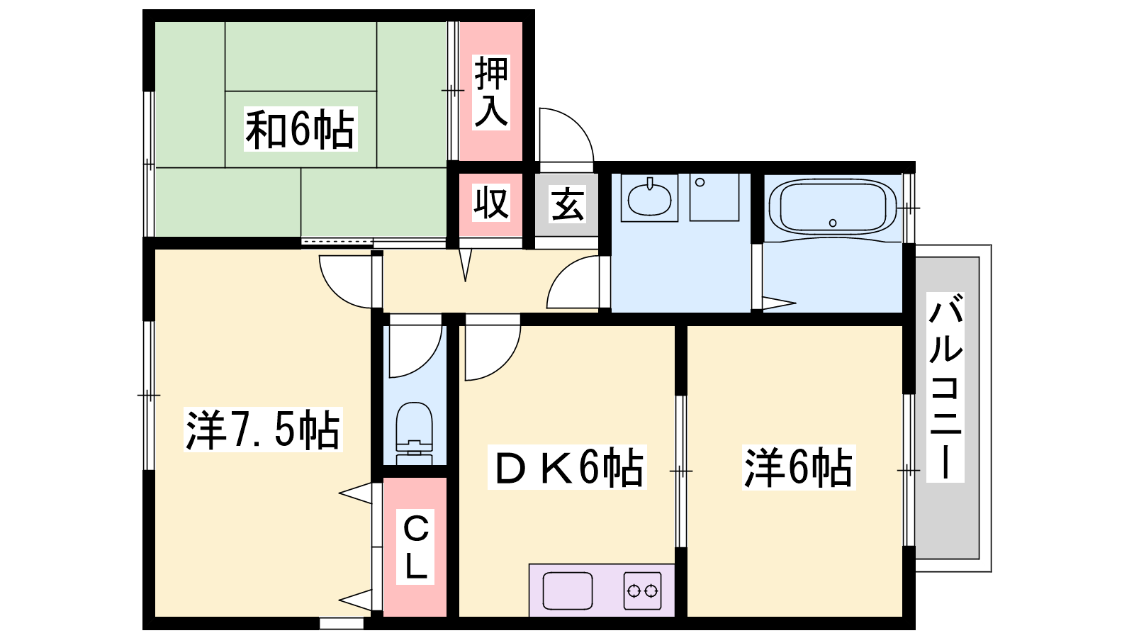 - DK6帖、洋室7.5帖、洋室6帖、和室6帖
