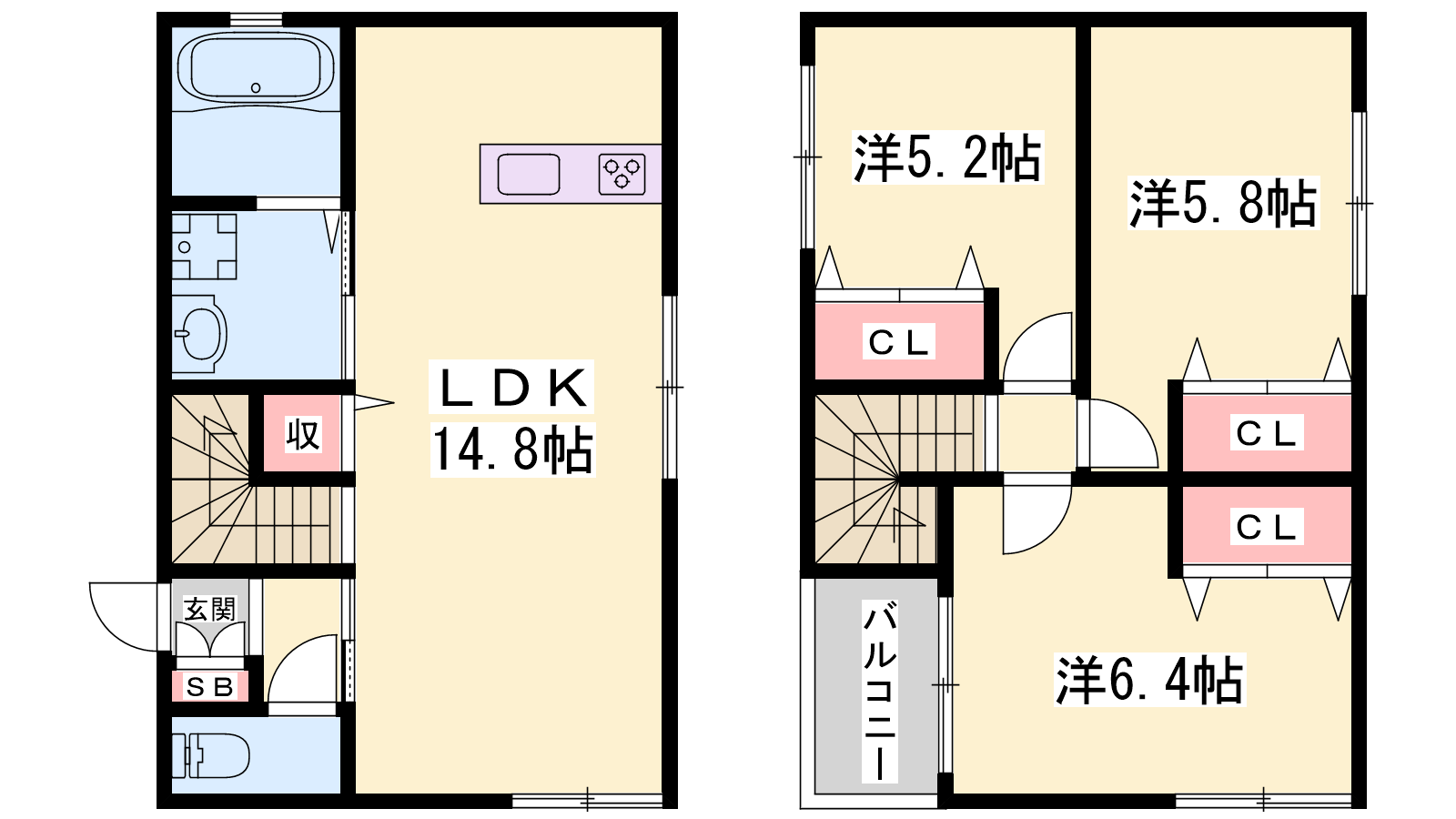 - LDK14.8帖、洋室6.4帖、洋室5.8帖、洋室5.2帖