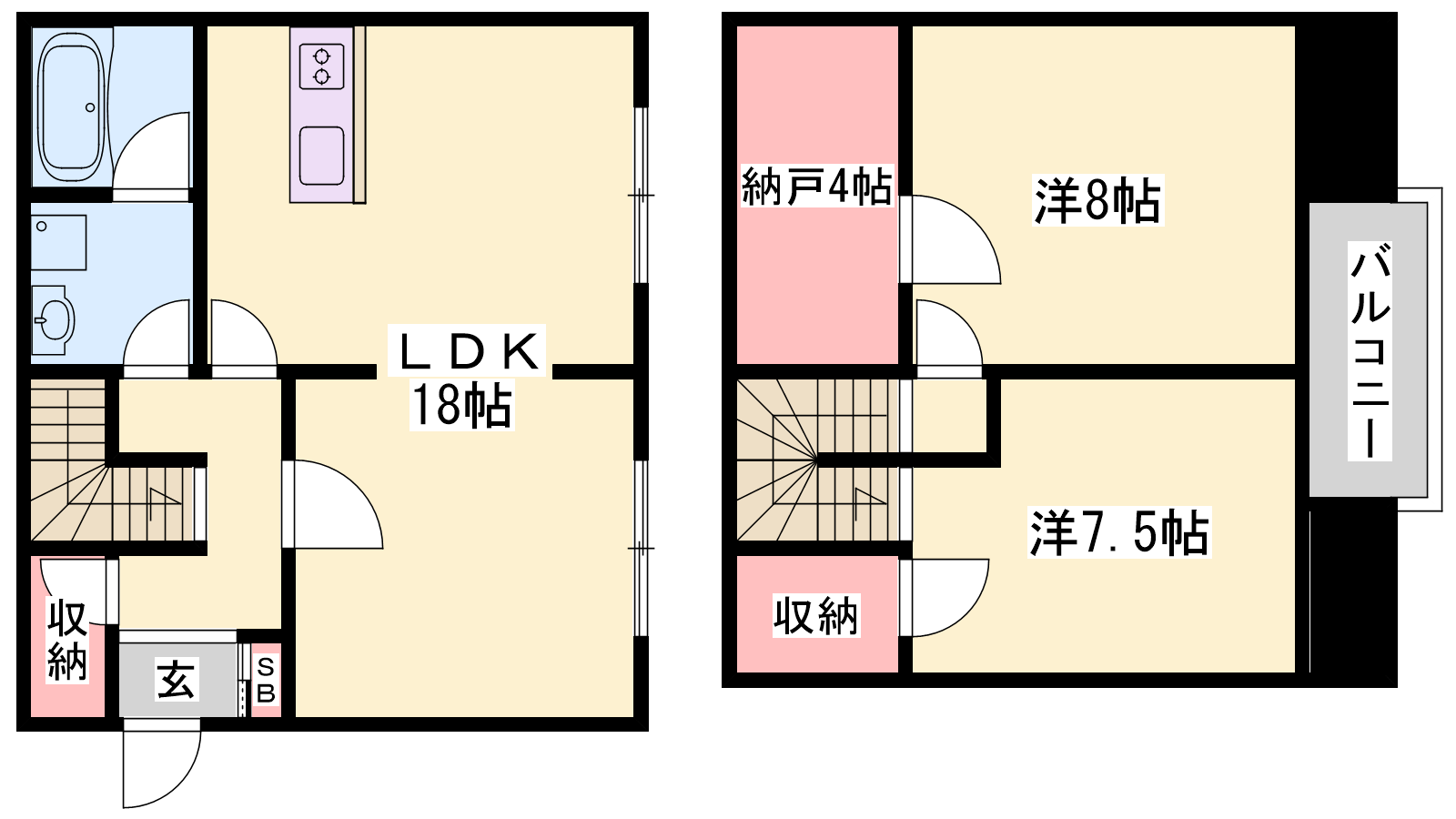 - LDK18帖、洋室8帖、洋室7.5帖、S4帖