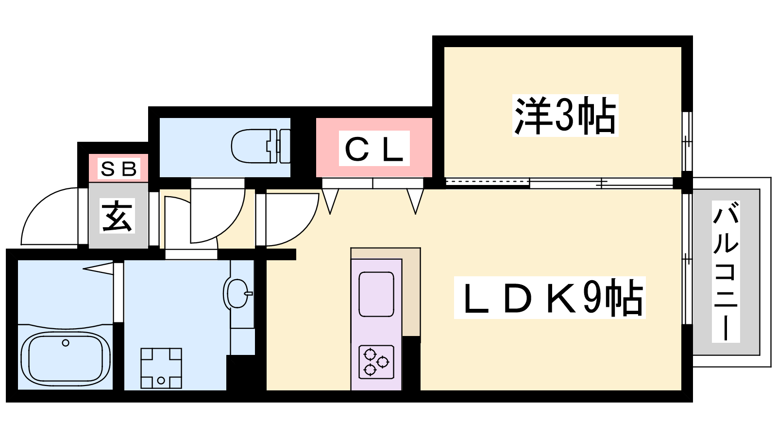 - LDK9帖、洋室3帖