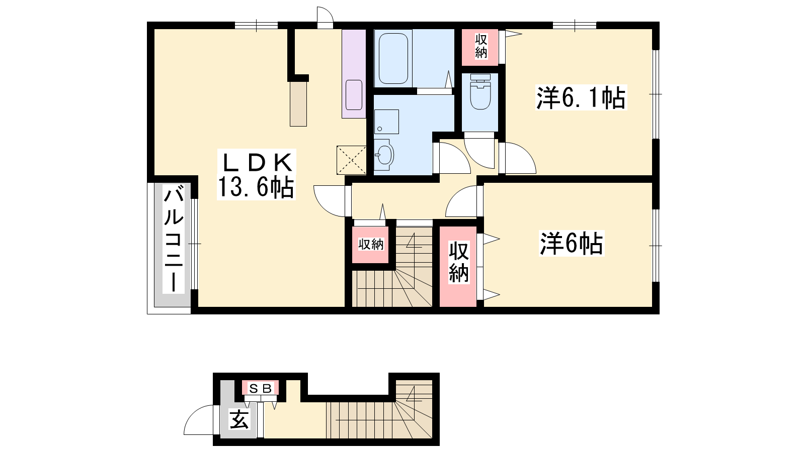 - LDK13.6帖、洋室6.1帖、洋室6帖